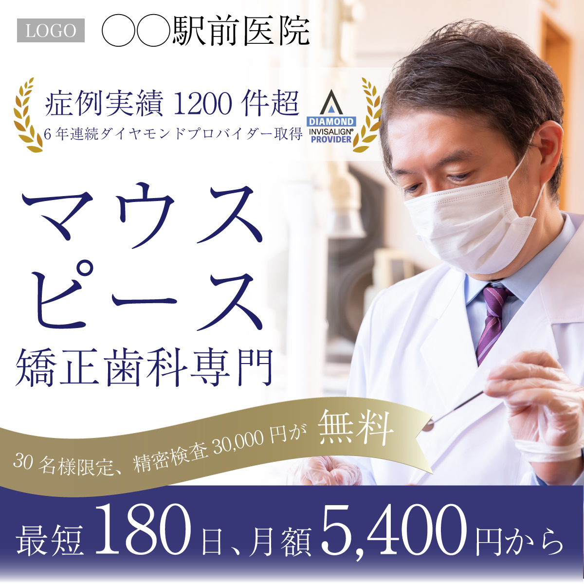 マウスピース専門の矯正歯科医院の広告バナーを作成いたしました。信頼感を抱いていただけるようにビジネススーツなどでよく使用されるネイビーをメインカラーに。検査費無料の文章はプレゼントを連想させるリボンの形のデザインにしました。